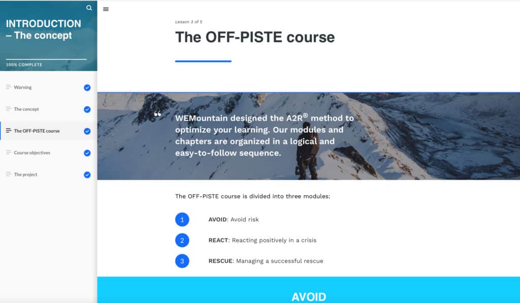 The course consists three modules: Avoid, React and Rescue.  Each module teaches learners how to manage and prevent risk, how to control and guide their combative instincts during an avalanche, and how to successfully manage the aftermath of a crisis, respectively.